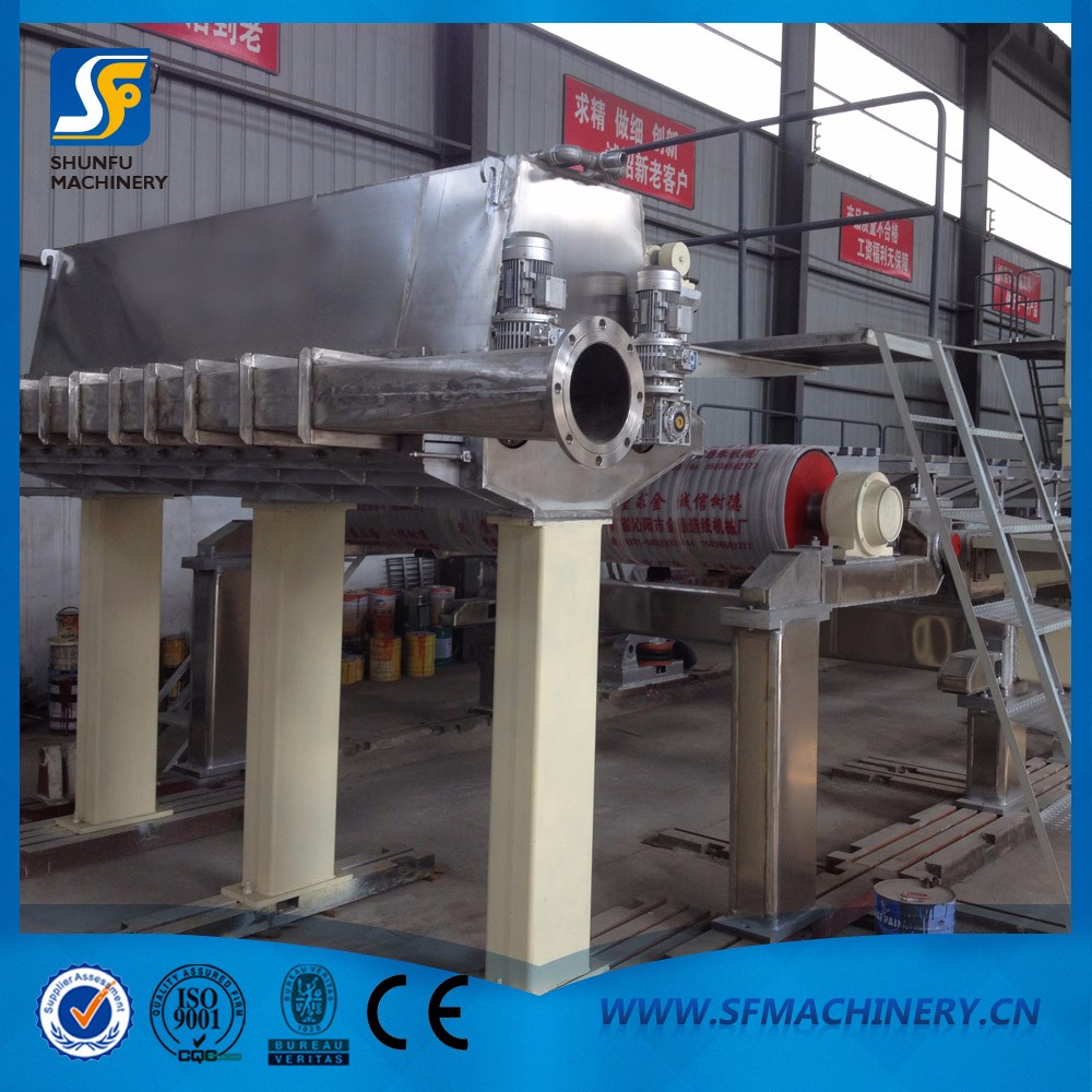 流漿箱的布漿器為方錐管總管進漿、臺階孔板布漿。勻整裝置為二根不同開孔率的勻漿輥。噴漿唇口采用關節式上唇板(分單/雙關節),唇緣配垂直小唇板,基上配有百分顯示、精密蝸輪箱調節小唇板微調裝置,上唇板最大開口>70~90㎜,方便清洗維護。上唇板調節采用手動蝸輪箱,平穩輕松。